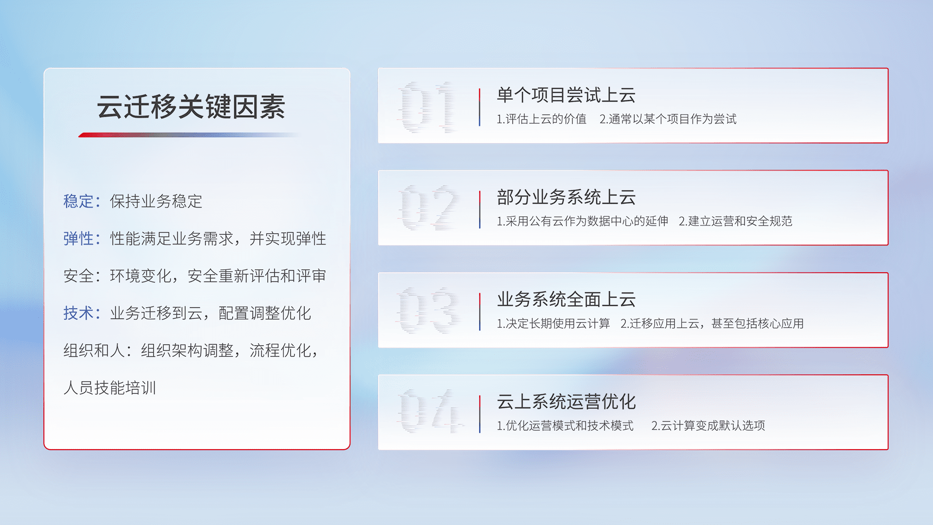 结合实际业务,,,从规划设计、、云平台选型、、、云原生改造、、、数据迁移、、、、集成交付,,迁移全过程为客户识别最佳上云路径,,,,做好风险识别管理,,设计网络架构、、身份权限、、、安全审计合规、、操作审计、、、日志审计、、监控告警策略、、、、多站点容灾设计等,,,,对云上基础设施进行整体规划,,,提升IT治理水平,,,,以满足弹性、、高可用、、、、高性能的需求。。。。